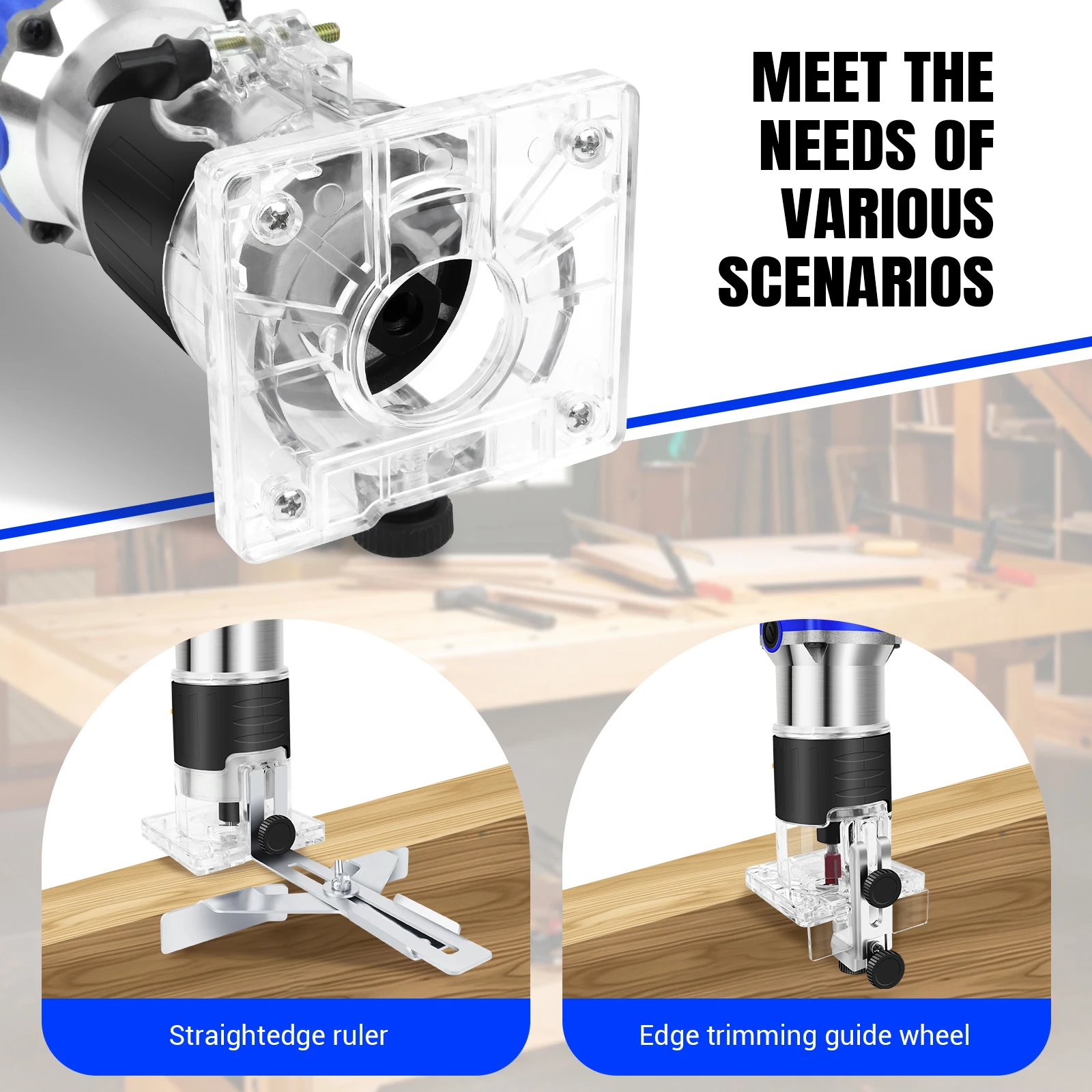 【Multifunctional Compact Router Woodworking Kit】It is ideal for professional and DIY use in the workshop or on site, and including trimmer fixed base for woodworking routing trimming.The straight guide are stable and not easy to deform, that ensures stable straight processing.