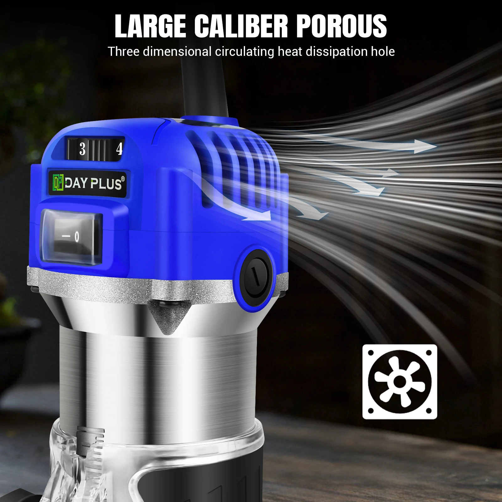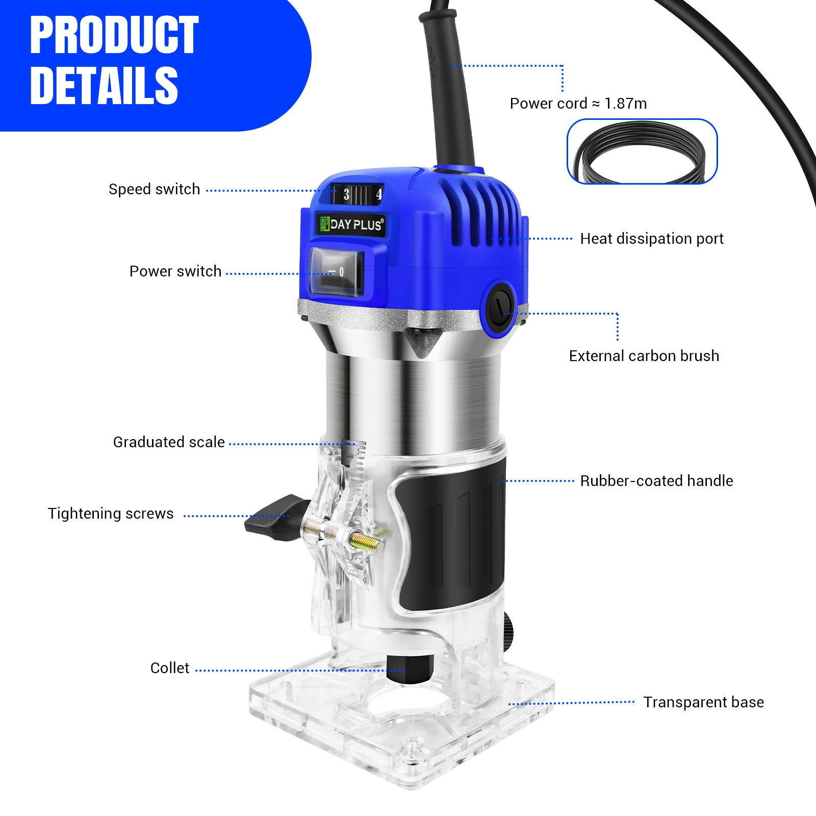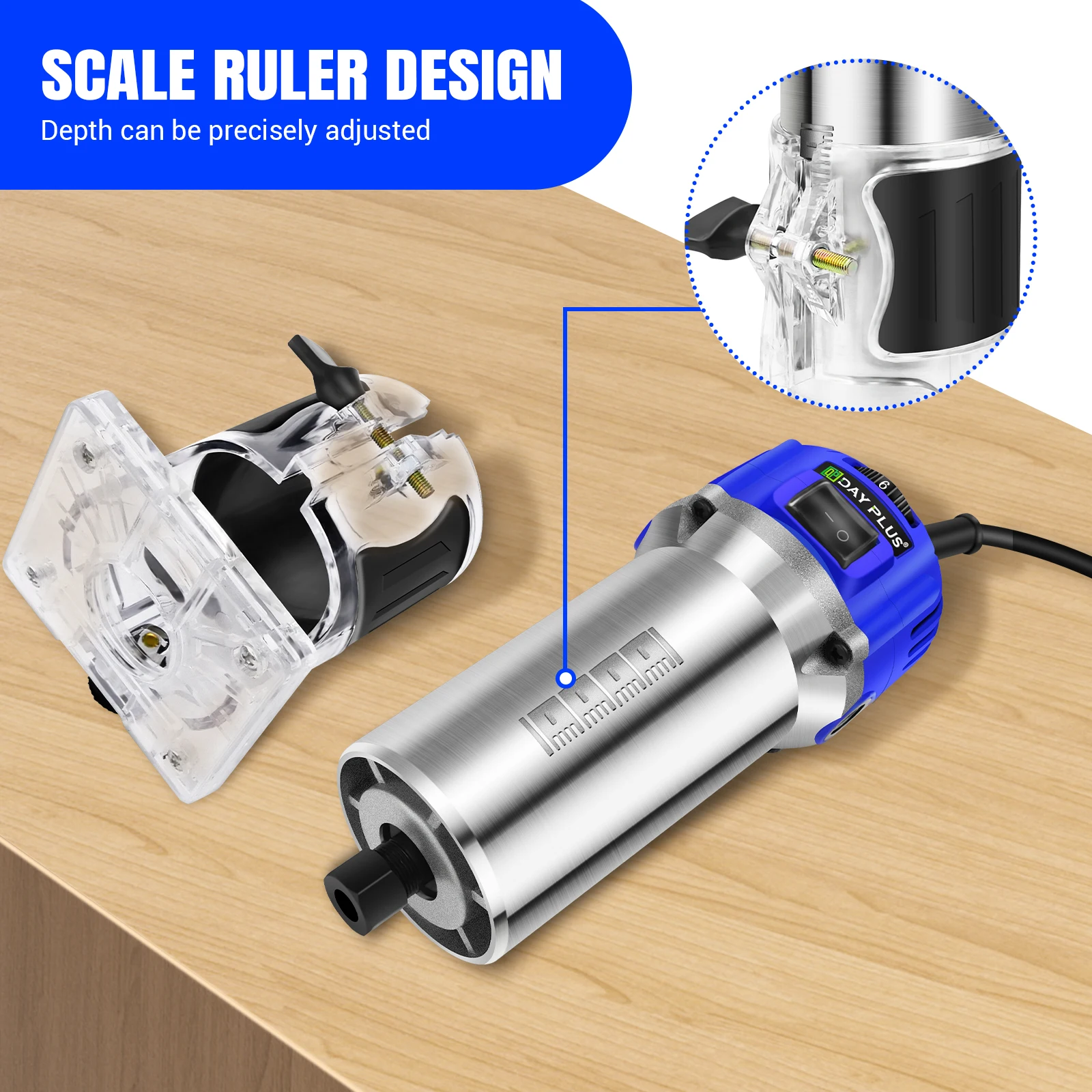 【Powerful Motor and Adjustable Speed】Wood Trimmer's variable speed control dial (8,000 to 50,000 RPM) helps craft hard wood more powerfully.Powerful motor has great performance,which can provide 2000 watt power for the toughest carpentry applications.
