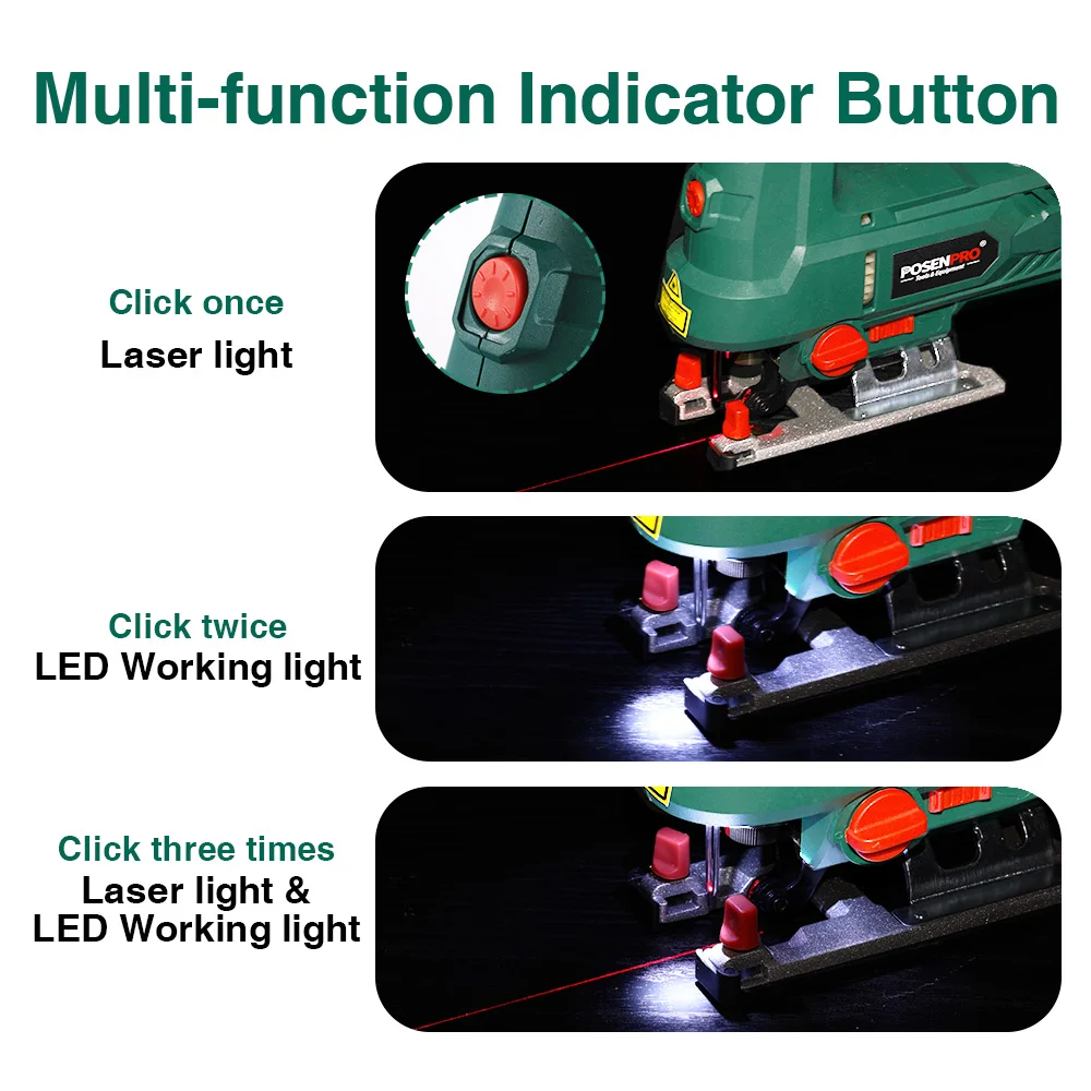 800W Jigsaw 6 Speeds 4 Orbital Positions Quick Blade Change Dust Blow Function ±45° Cutting Angle Includes Dust Pipe Guide Ruler