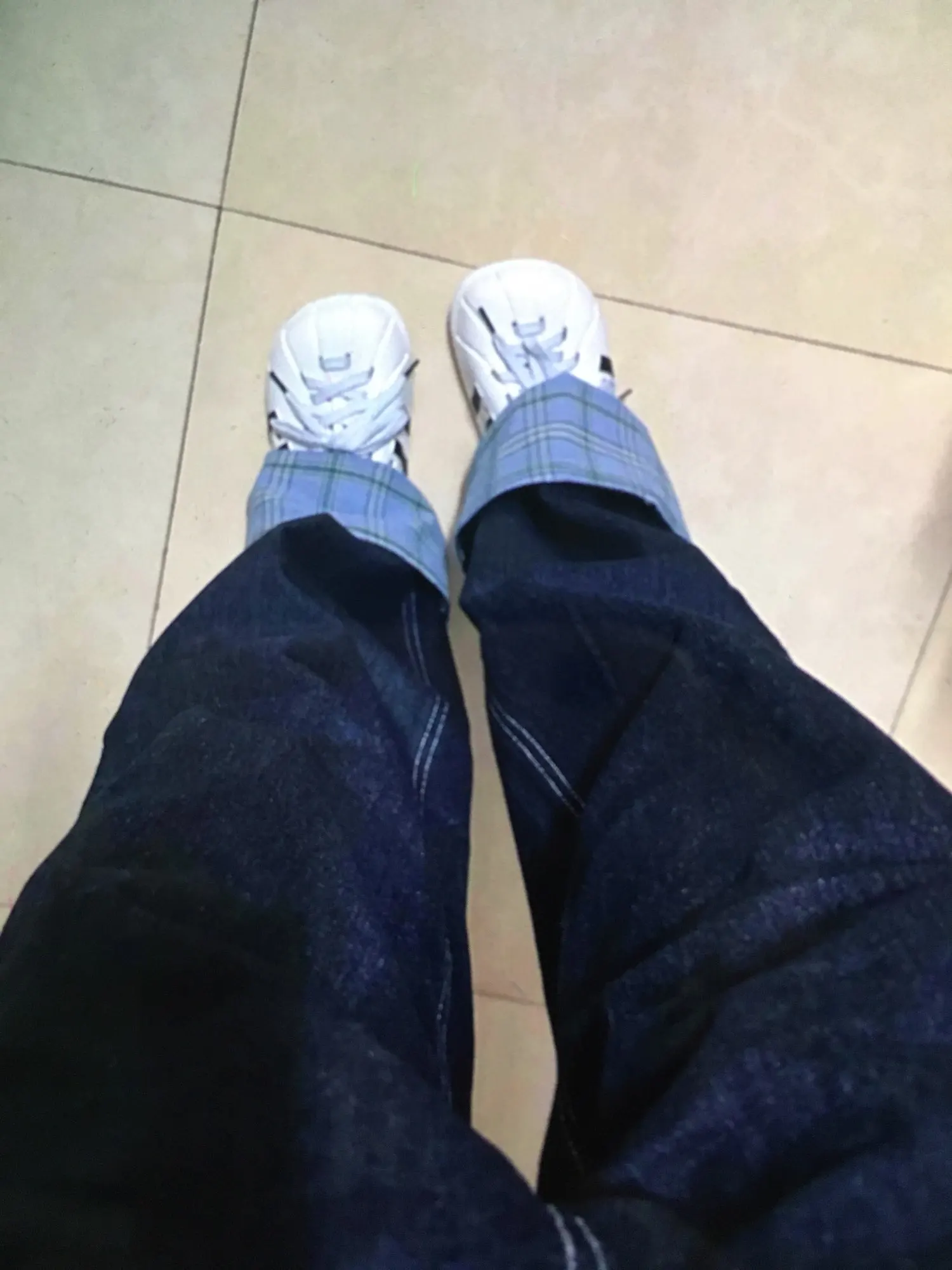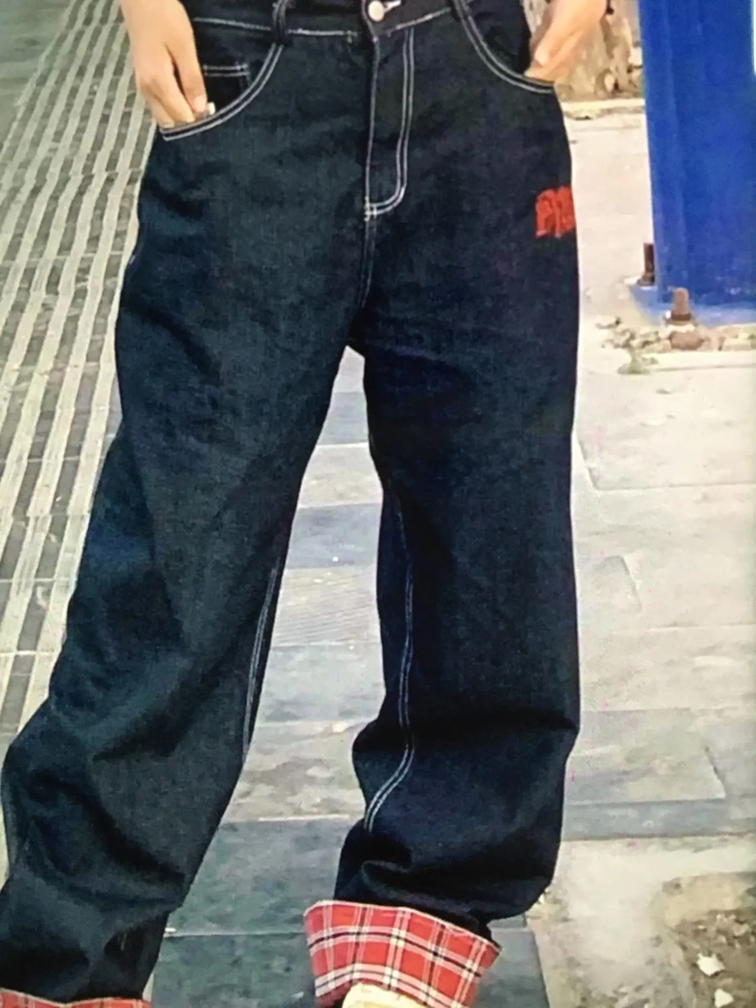 American retro plaid patchwork rolled edge women jeans high street Harajuku loose wide leg straight leg men and women pants