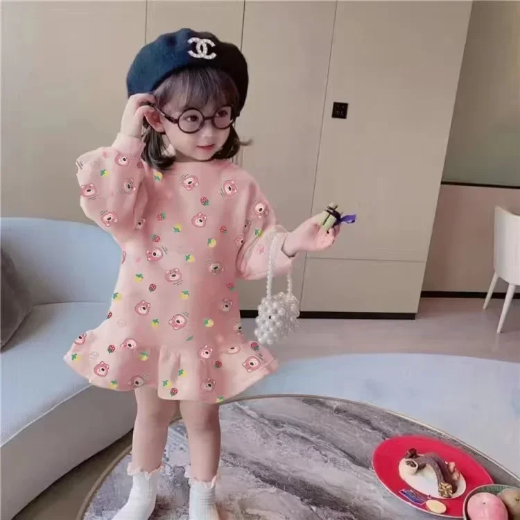 Girls' Dress Cartoon Strawberries  Autumn New Korean Girls' Splicing Pleated Dress Printed Baby Kids Casual Clothes