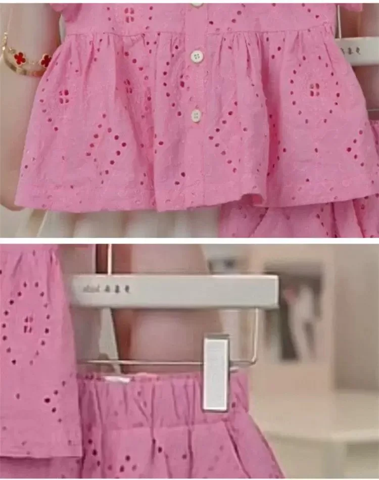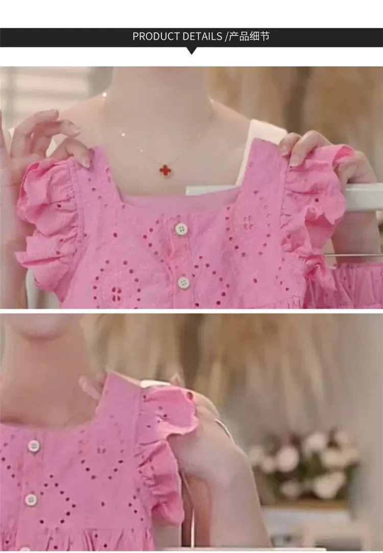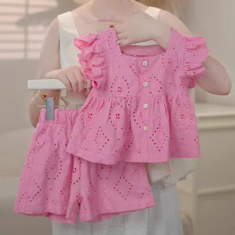 New Korean style girls' summer pink cotton suit baby hollow small flying sleeve top + shorts two-piece sweet baby girl suit