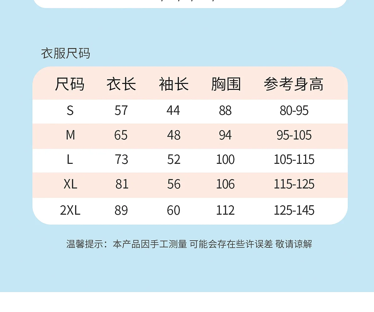 2XL: Length 89cm, Bust 112cm, Sleeve length 60cm, Reference height 125-145cm