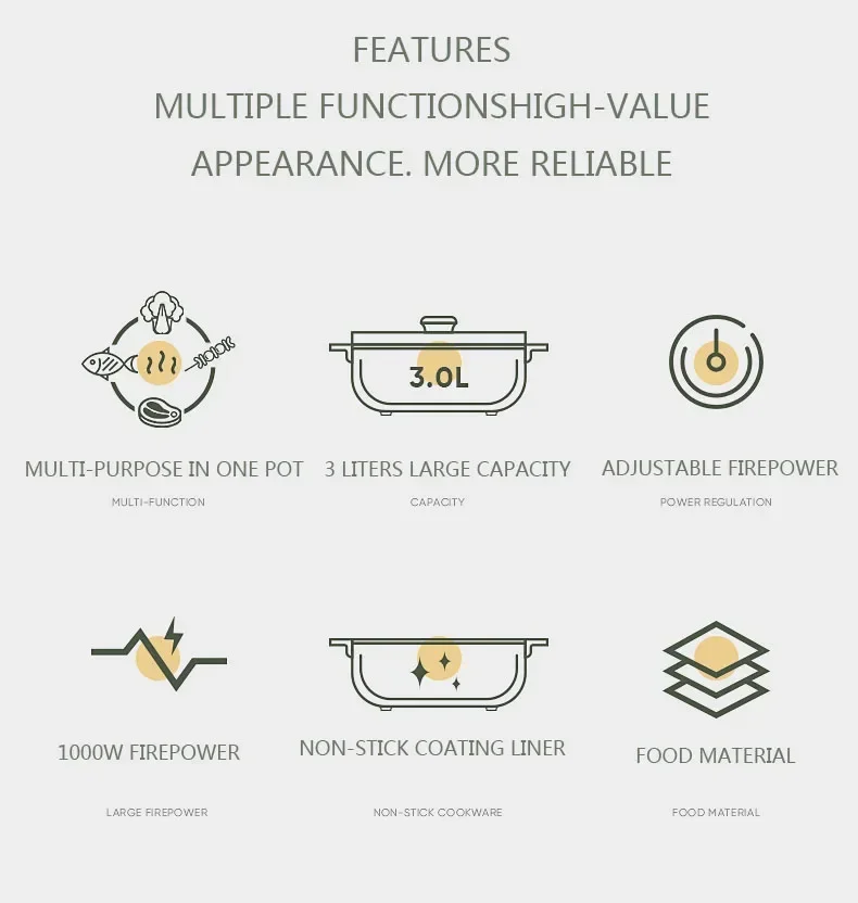 Electric heating/hot pot function: Stir-fry, fry, boil, hot pot, noodles